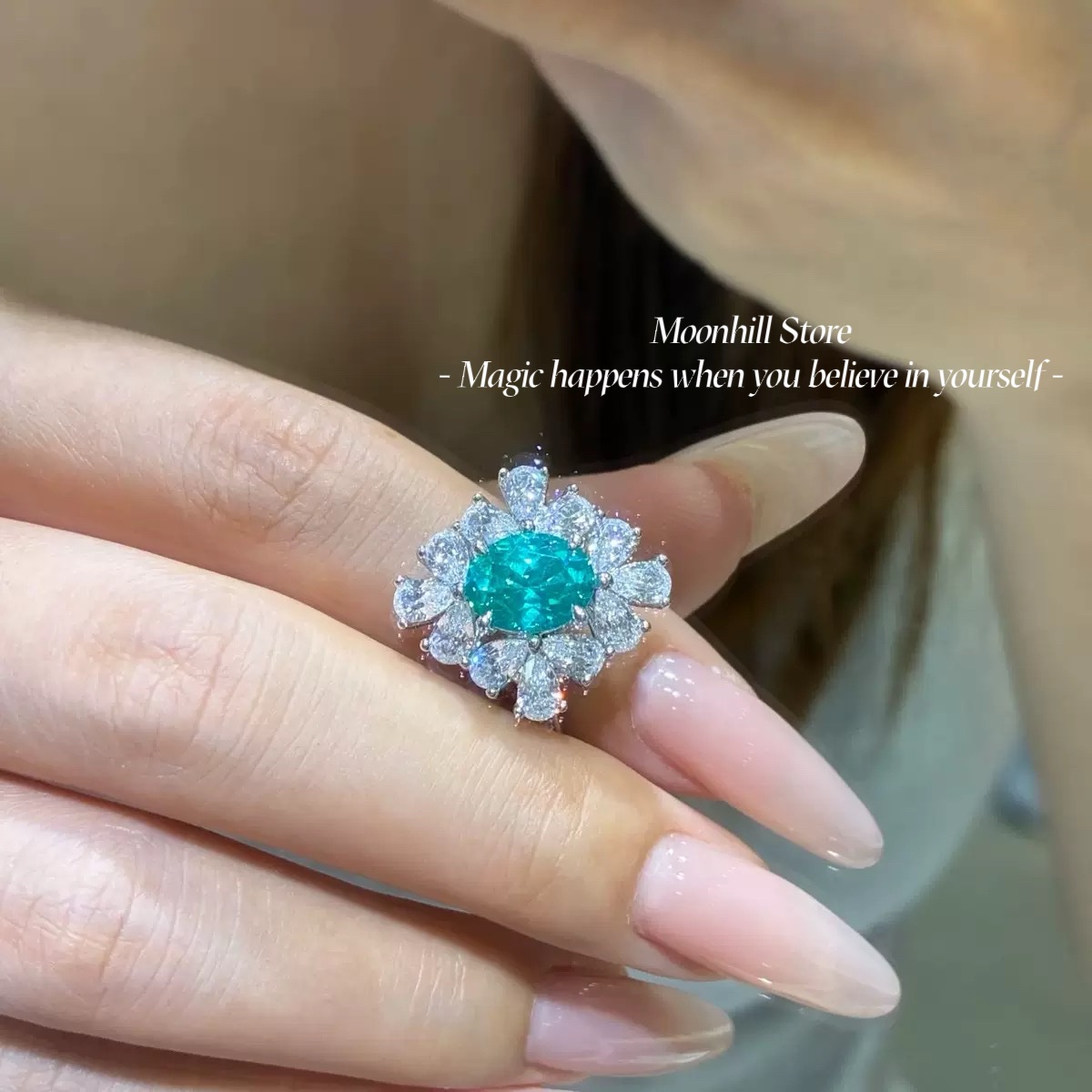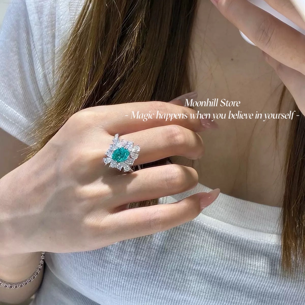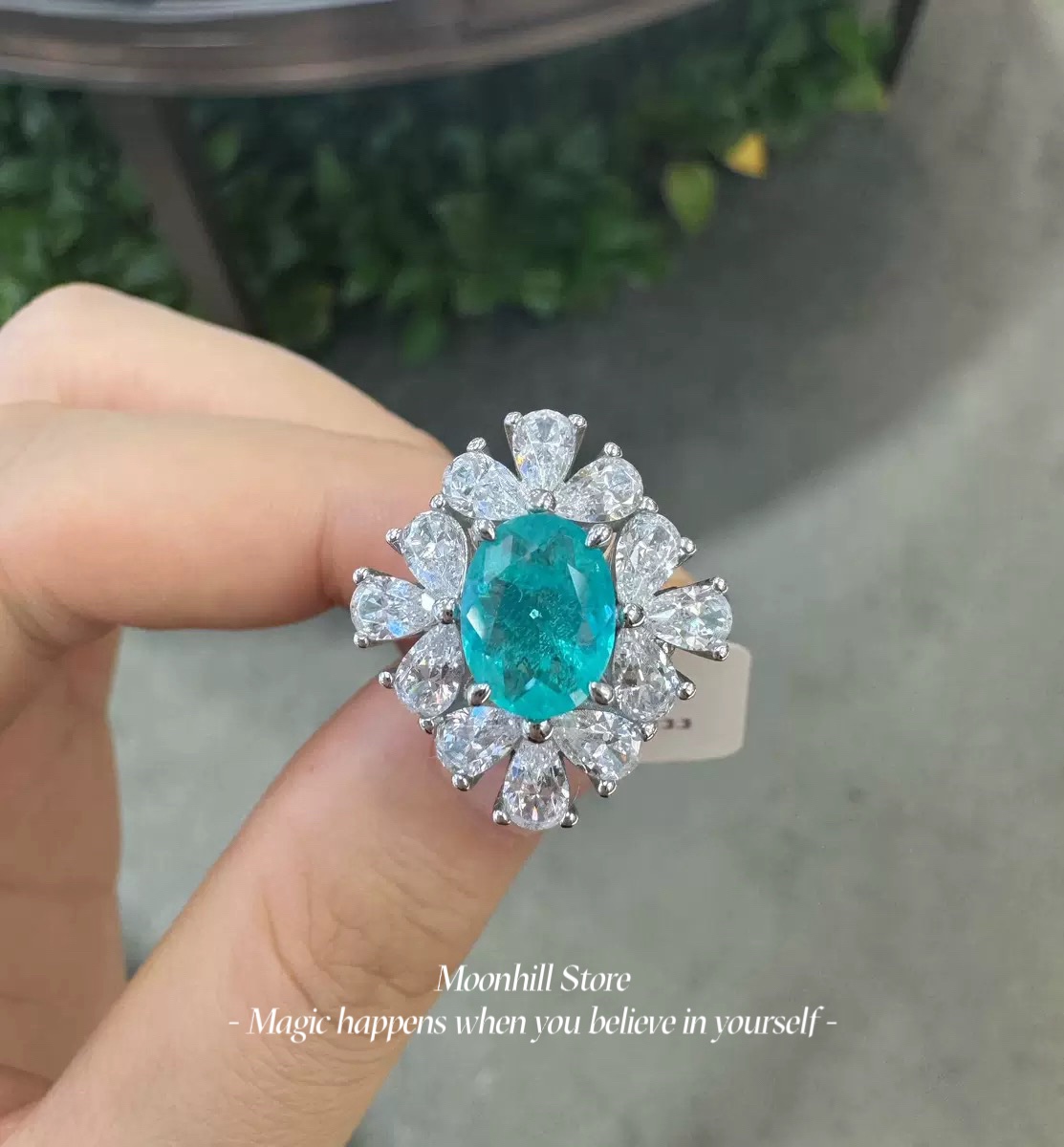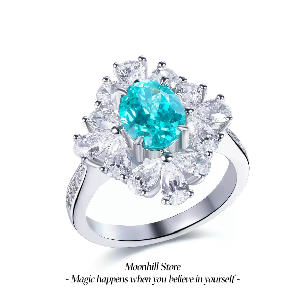 This elegant ring is crafted from premium S925 sterling silver and features a brilliant 7×9mm lab-created Paraiba tourmaline at its center. Surrounded by sparkling 5A cubic zirconia in a radiant halo design and finished with 18K white gold plating for lasting shine, this piece combines timeless elegance with modern craftsmanship. Perfect for both special occasions and everyday wear, it makes a sophisticated statement of style and grace.
